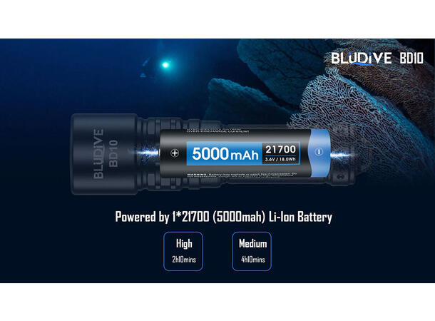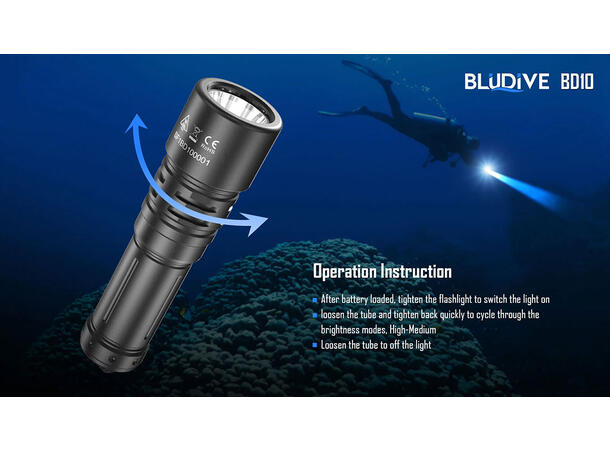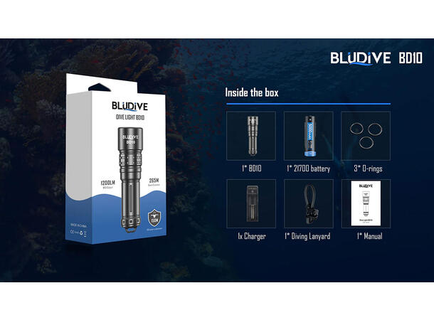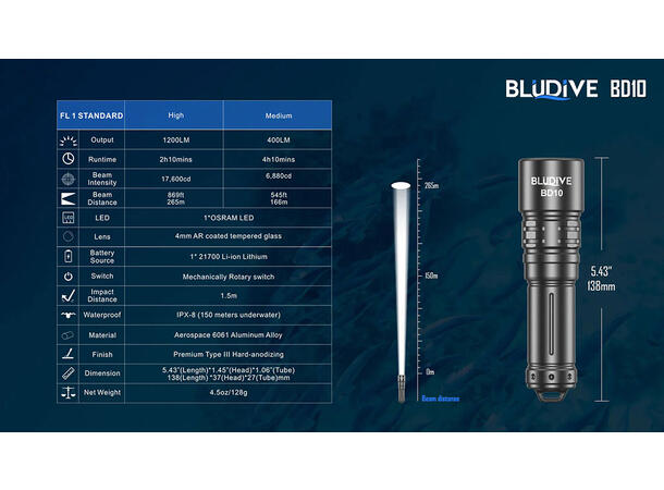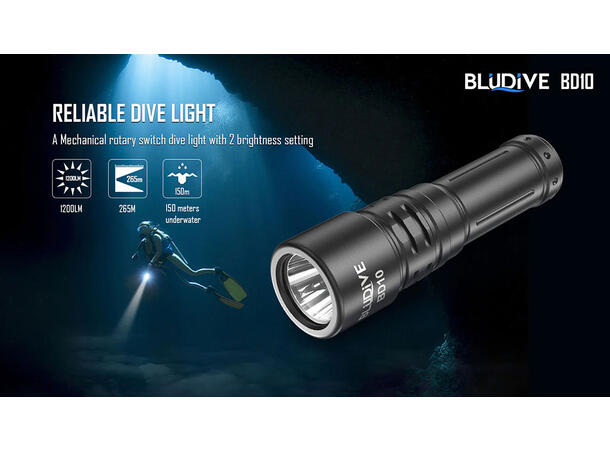 BluDive BD10 lommelykt, Vanntett 1200lm / 265 meter kastelengde