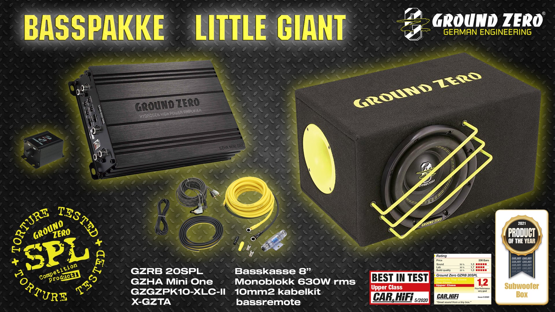 - En basspakke som ikke bør undervurderes selv av de basshungrige. Lite fotavtrykk men voldsom ytlse ga inpirasjon til navnet "Little Giant". Denne basskassen fra tyske Ground Zero ble kåret til årest produkt av leserene av anerkjente Car & HiFi. Den drives av meget gode og monteringsvennelige GZHA MINI-ONE forsterkeren som er en av de beste til høynivåjobber (dvs at en tapper signal fra høyttalerledning) der man er avhengig av ekstra gode innebygde delefilter for å få et optimalt resultat.