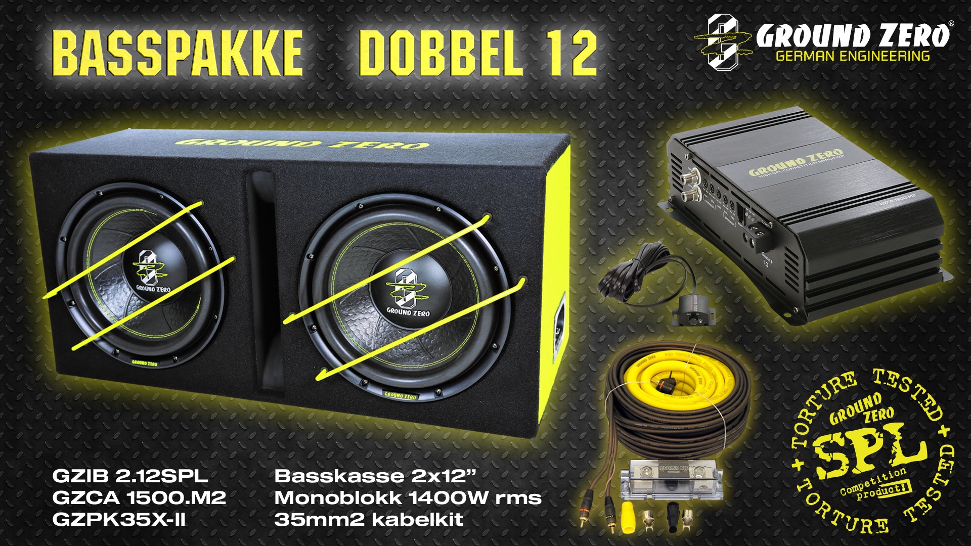 Ground Zero Dobbel 12" Basspakke SPL 2x12" SPL basskasse + forsterker + kabler