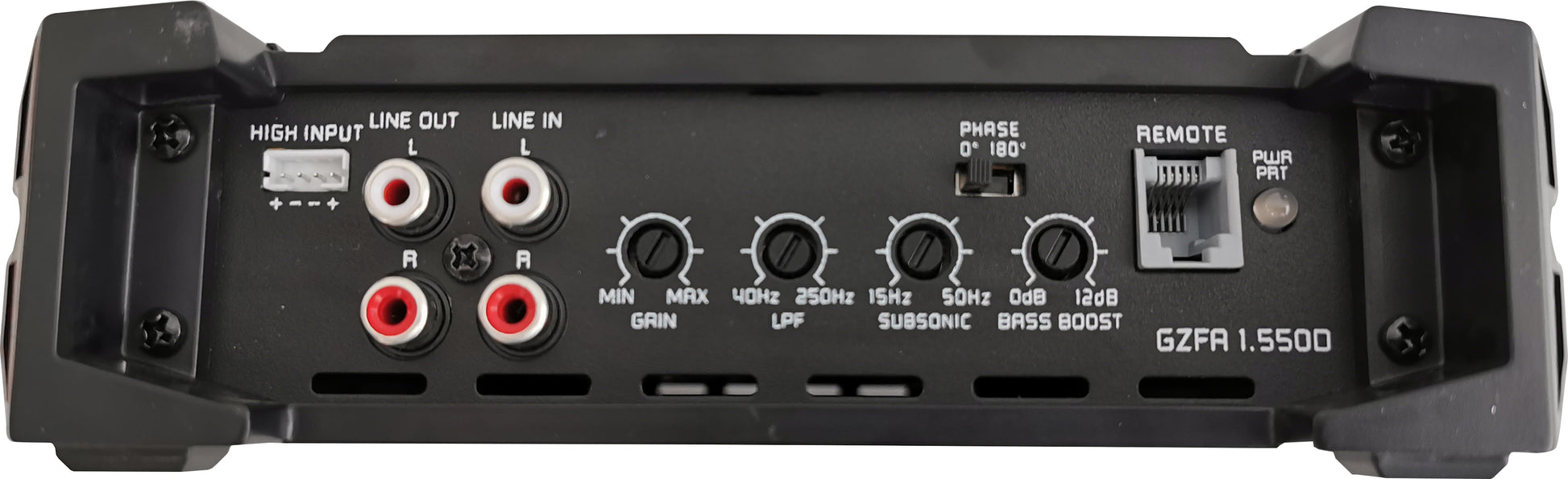 - GZFA 1.550D - høykvalitets klasse D-forsterker - 1-ohm stabil - Variabelt lavpassfilter - Justerbar bassforsterkningsfunksjon - Høynivåinngang med auto-på-funksjon - Justerbar inngangsfølsomhet - Slå-på forsinkelse og termisk beskyttelseskrets - Kablet fjernkontroll er inkludert