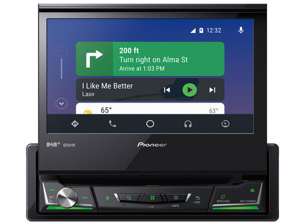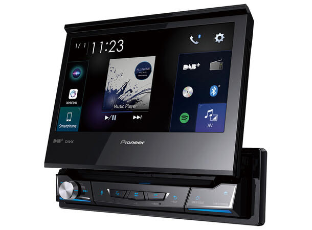 AVH-Z7200DAB går fra 1-DIN til 7 tommer med full bilunderholdning på få sekunder. Når den store berøringsskjermen brettes ut, lar denne multimediespilleren deg koble til en kompatibel iPhone eller Android-telefon med en enkel USB-kabel, som lar deg kontrollere Apple CarPlay, Android Auto, WebLink og Waze (via Apple CarPlay eller Android Auto) fra dashbordet på en praktisk og sikker måte. Den spiller av DAB/DAB+ Digital Radio, lyd- og videoinnhold fra CD-er, DVD-er og USB-enheter.