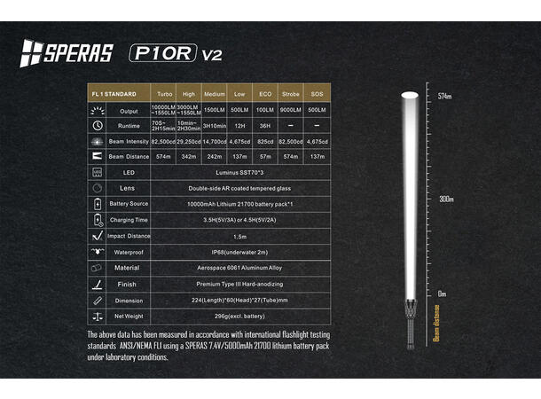 Merk! Alle verdier er målt og kontrollert i henhold til internasjonale test standard ANSI/NEMA FL1 med bruk av en Lithium batteripakke (7,4V/10.000mAh) i laboratorieforhold.