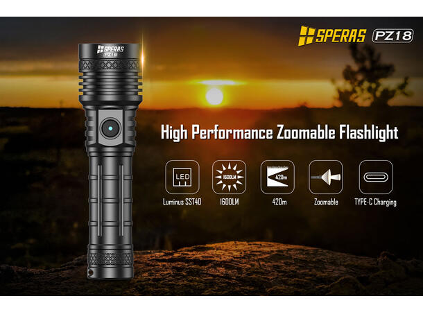 Speras PZ18 lommelykt med zoom 1600lm / 420 meter kastelengde