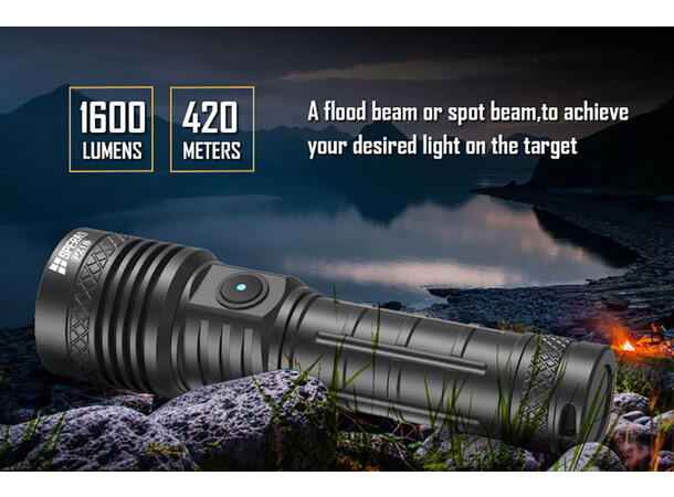 - Maks: 1600lm - kastelengde flood 85 meter, 333lm - Kastelengde spot 420 meter - Batterivarighet 1 timer 48 min