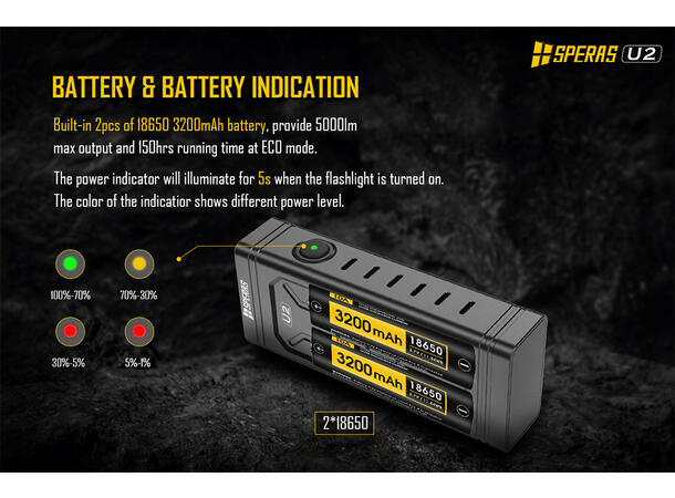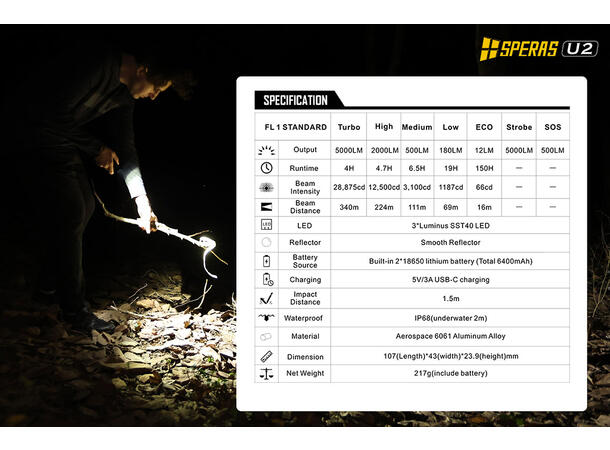 - Maks: 5000lm - kastelengde 320 meter - Batterivarighet 4 timer