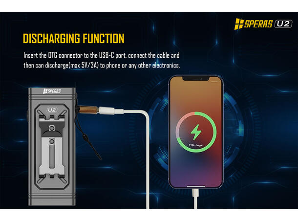- Enheten lades på ca 2 timer 15 min med den medfølgende TYPE-C ladekabel