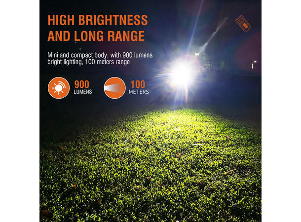 Liten og kompakt lommelykt på hele 900lm med dobbel lykt som gir en kraftig lysstråle som rekker hele 100 meter.