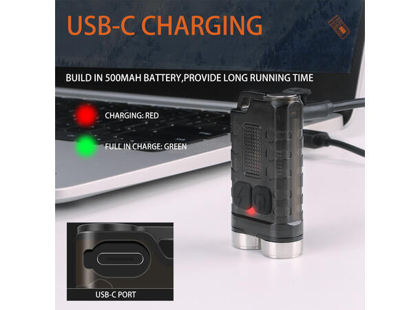 Innebygd batteri på 500mah som lades med den medfølgende Type-C ladekabelen